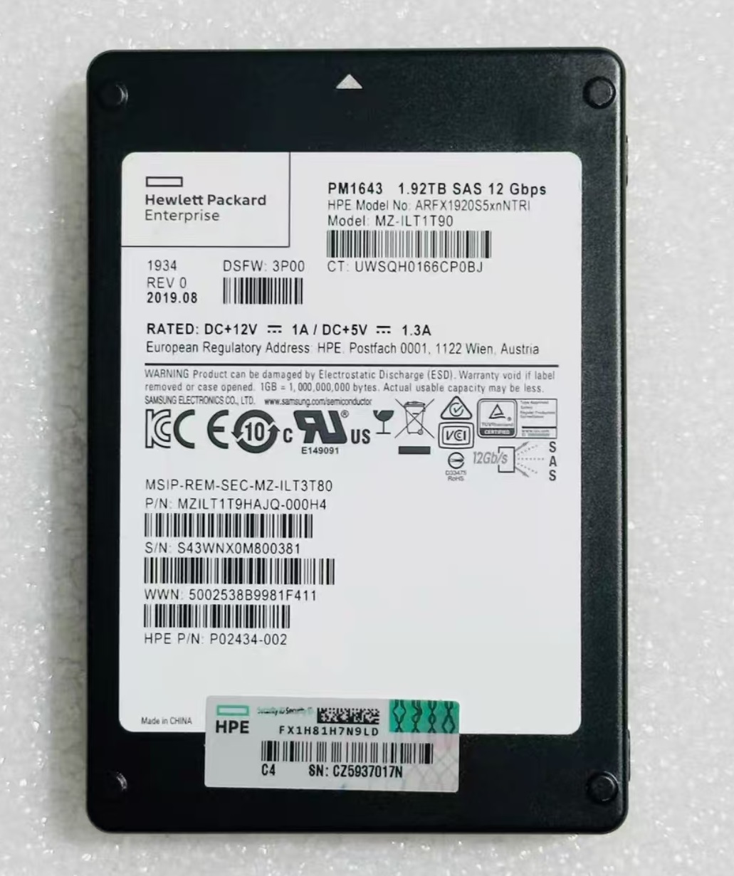 HPE P02434-001 (disk body model PM1633a) is an early generation but classic and widely validated enterprise NVMe solid-state drive. It belongs to the read intensive model in HPE NVMe product line, designed specifically for HPE ProLiant Gen9 and Gen10 server platforms, aiming to provide critical upgrades from SAS/SATA to high-performance NVMe storage for these platforms. This hard drive is renowned for its excellent reliability, stability, and deep integration with HPE servers, making it one of the preferred solutions for many enterprises to achieve storage acceleration at that time.